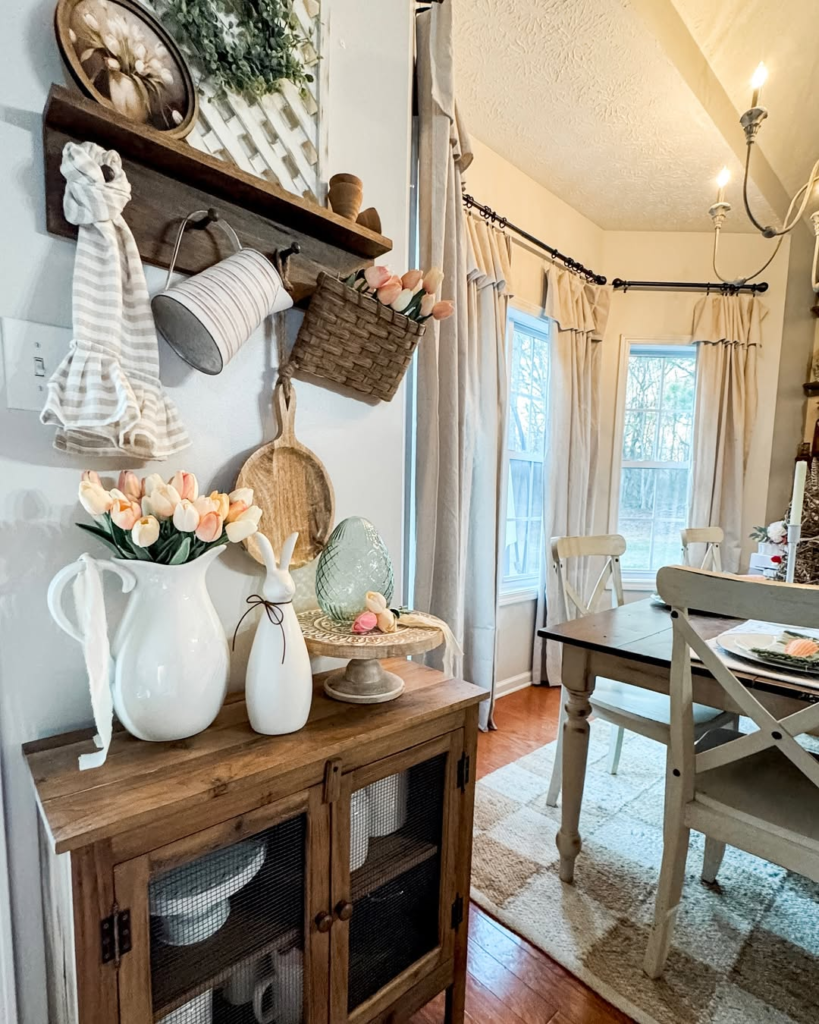 This quiet corner proves that Easter decor doesn’t need to be loud to be beautiful. Soft peach tulips in white pitchers, natural wood accents, and understated bunny decor offer a refined, peaceful approach to seasonal styling. The hanging woven basket with tulips adds a gentle pop of color without overwhelming the space.