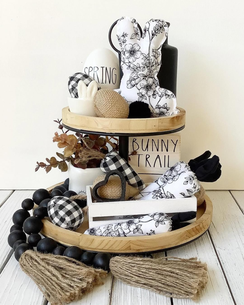 This modern take on Easter mixes monochrome styling with seasonal whimsy. Black-and-white florals, checkered hearts, and a minimalist “Bunny Trail” sign create a sophisticated yet playful look. Burlap accents, wooden rounds, and layered beads maintain a grounded, farmhouse feel, while crisp black tones elevate the palette.