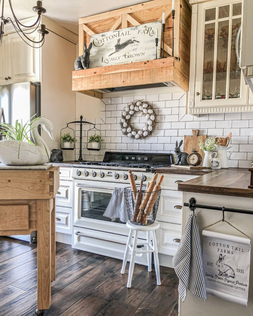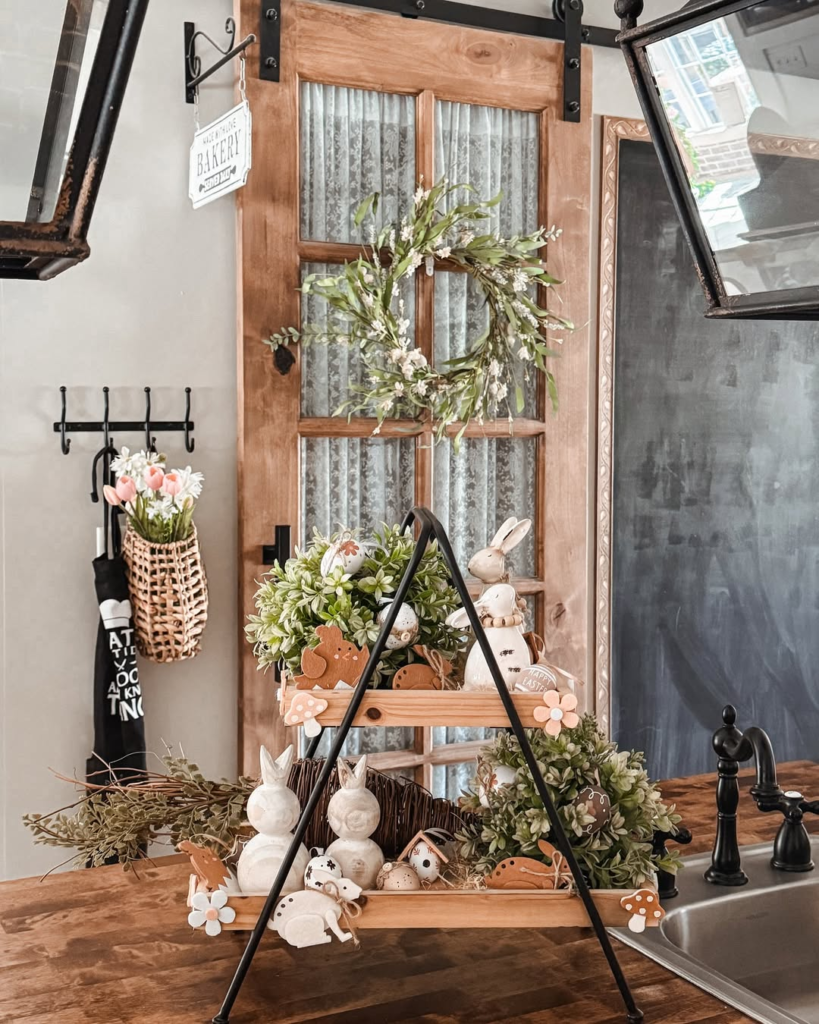 This farmhouse kitchen mixes rustic and soft elements seamlessly. Cheeky signage, cotton wreaths, and subtle bunny décor bring charm, while wooden surfaces and metal accents provide grounding. Everyday items, like rolling pins and towels, add authenticity and warmth.