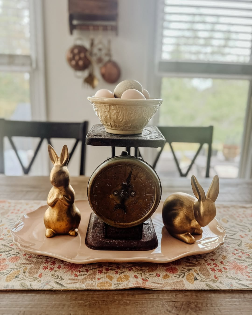 Elevate your Easter styling with touches of vintage sophistication. Burnished gold bunny figurines flank an antique kitchen scale holding muted Easter eggs, creating a vignette that’s simple but refined. The contrast between aged metals and delicate floral runners adds a subtle, luxurious flair.