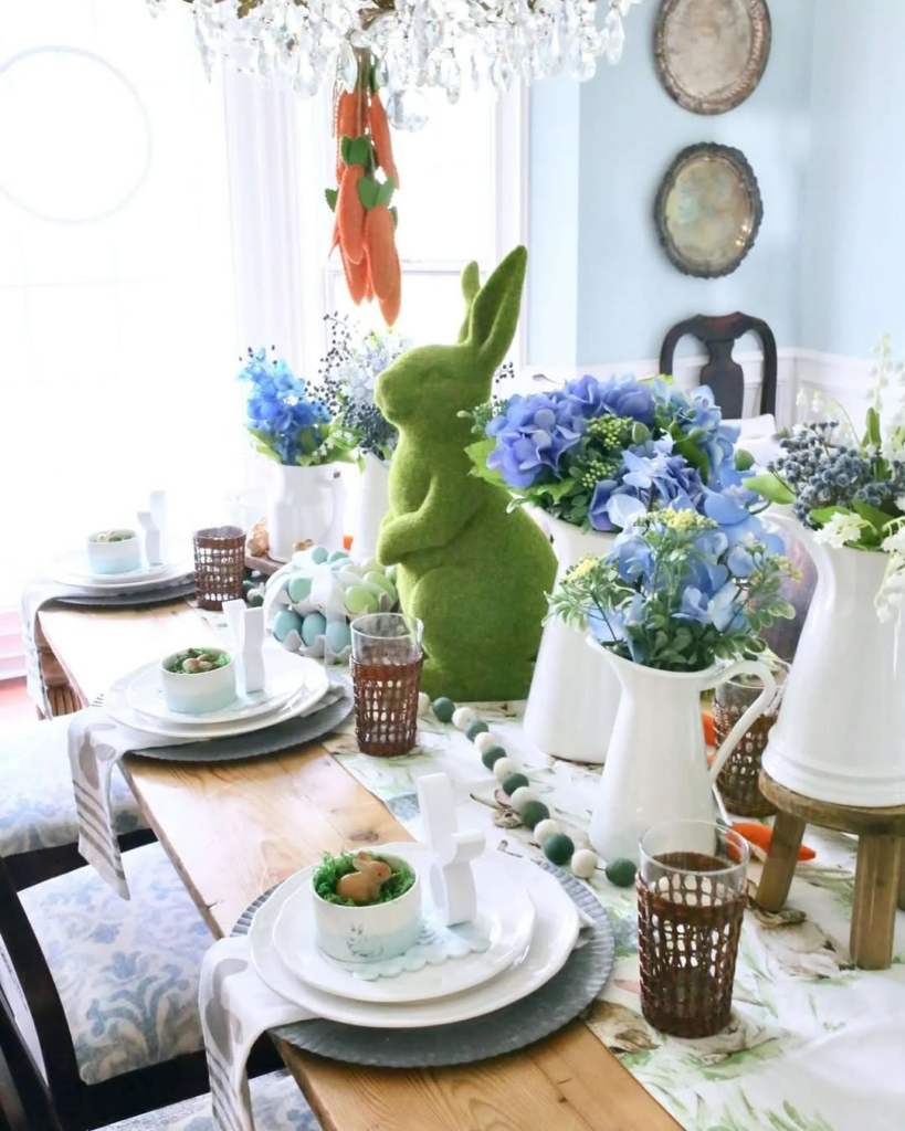 This dining table combines bold layering with whimsical charm. A moss bunny centerpiece surrounded by blue hydrangeas, ceramic pitchers, and pastel eggs creates a festive focal point. Textured placemats, woven cups, and a bunny-themed runner complete the look, while felted wool balls and hanging felt carrots add playful detail.