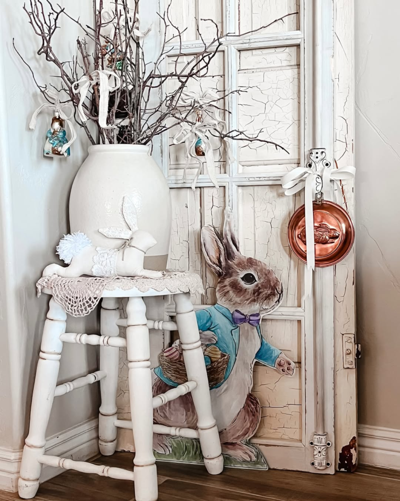 This Easter vignette radiates subtle nostalgia. Creamy, vintage tones and rustic textures create a warm, welcoming atmosphere. A paper bunny dressed in a Peter Rabbit-style coat, a branch bouquet, and handcrafted accents bring whimsy without overwhelming the space.