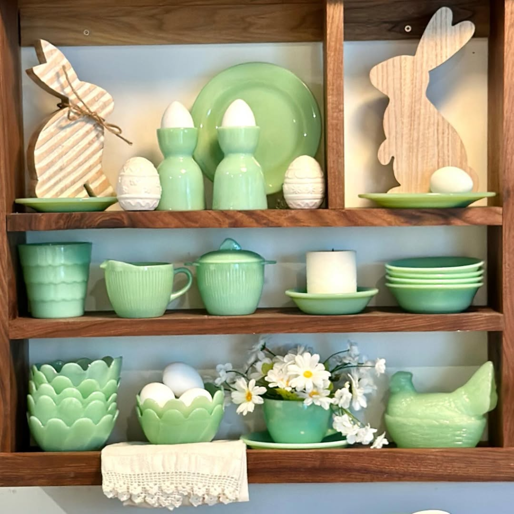 Jadeite-green dishes take center stage in this open shelving display, paired with subtle bunny silhouettes and cutouts. The setup balances practicality and charm, with ridged creamers, fluted bowls, and speckled eggs adding textural interest.