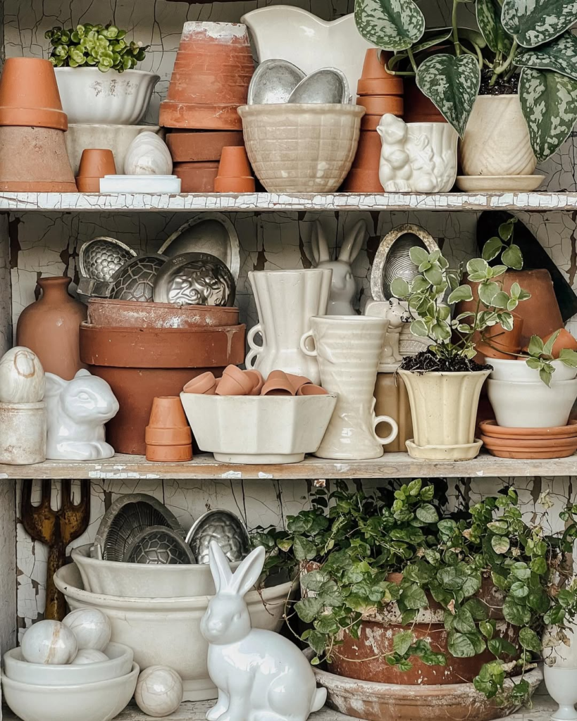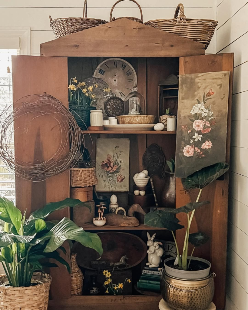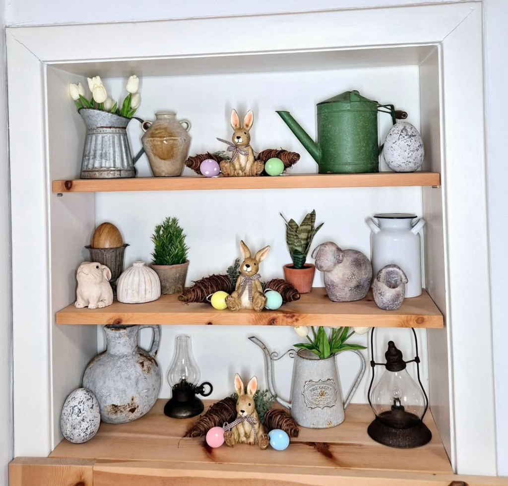 This niche display combines rustic textures with playful details. Vintage vases, ceramic rabbits, pinecones, and pastel eggs create a charming, evolving seasonal display. The shelves feel curated yet flexible, with whimsical touches balanced by grounded materials.