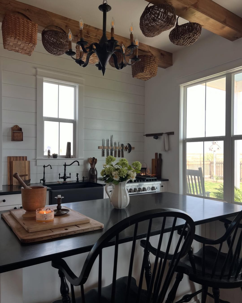This kitchen combines rustic drama with functional elegance. Matte black counters, vintage fixtures, and a statement chandelier create visual interest, while hanging baskets and curated shelving provide practical artistry. The space feels lived-in, intentional, and warm—a perfect balance of style and homestead comfort.