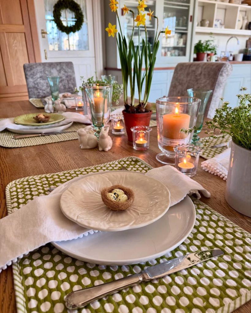 This brunch setup balances polished styling with cozy charm. Woven green placemats, mini nests at each place setting, and flickering candles create a festive yet relaxed atmosphere. Terracotta pots of daffodils provide cheerful pops of color without overwhelming.