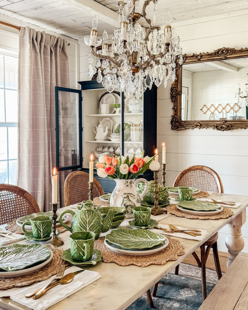 The result is a joyful, inviting tablescape perfect for a spring gathering, balancing farmhouse charm with imaginative styling.
