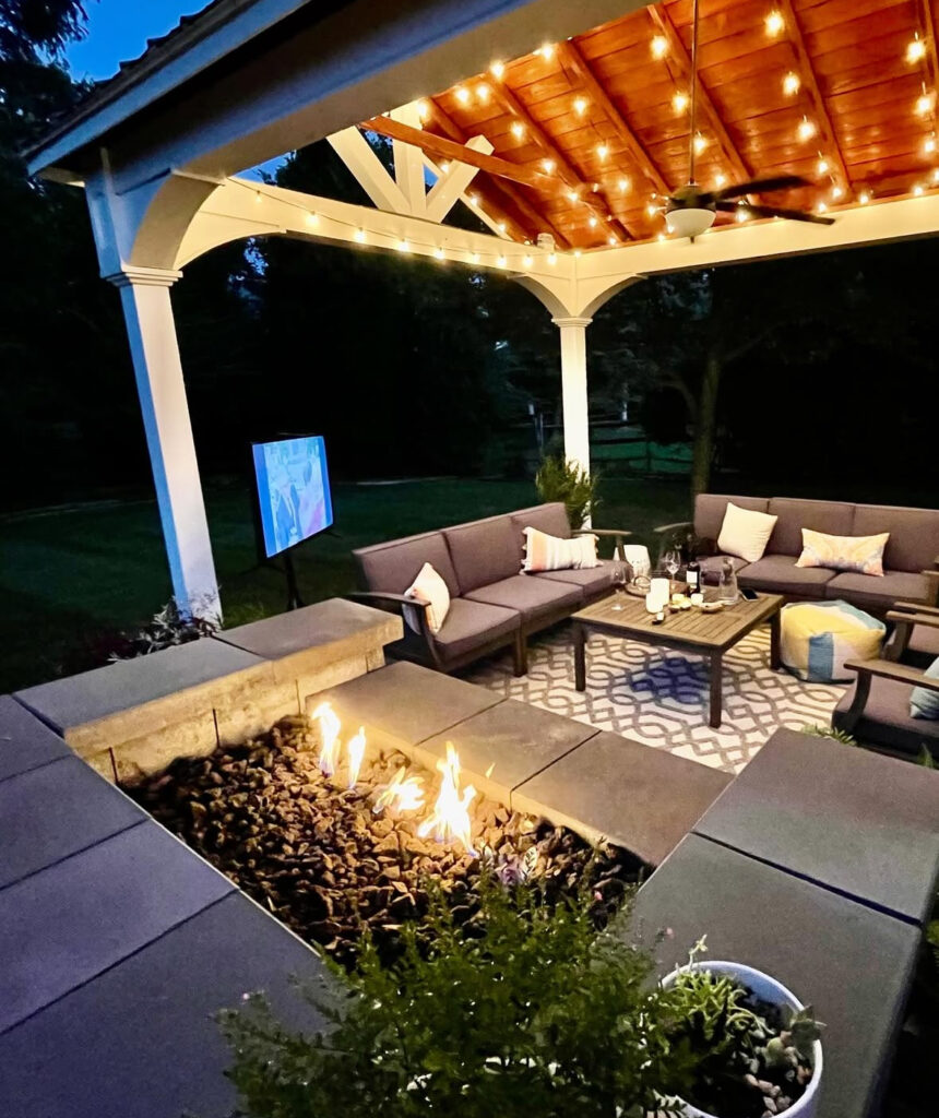Dreaming of a fire pit you can enjoy year-round? A covered fire pit setup under a gazebo or pergola is the answer. Rain or shine, it provides a cozy gathering spot that bridges indoor comfort with outdoor charm. String lights above the fire pit complete the warm, inviting look, proving that a little shelter goes a long way in creating a functional outdoor oasis.