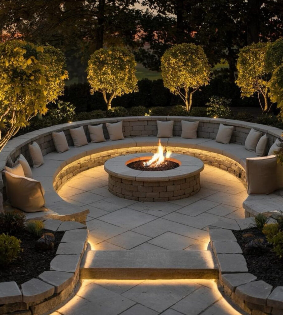 Few things feel as luxurious as a sunken stone fire pit. The natural textures, paired with subtle under-seat lighting and lush greenery, make this design both modern and earthy. It’s the kind of setup that makes guests linger longer—and a stunning way to blend fire features with thoughtful landscaping.