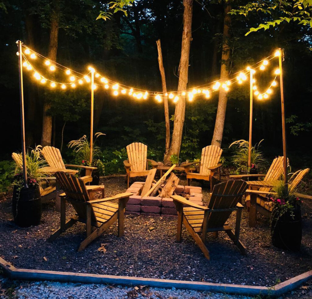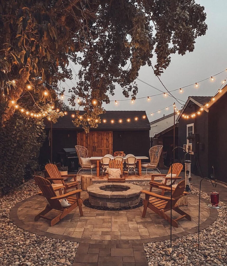 Adirondack chairs, a simple stone ring, and a touch of nature—this setup defines rustic charm. Add a few overhead lights or lanterns, and you’ve got an inviting outdoor living space that’s perfect for quiet nights or casual gatherings. Proof that timeless design doesn’t need to be complicated.