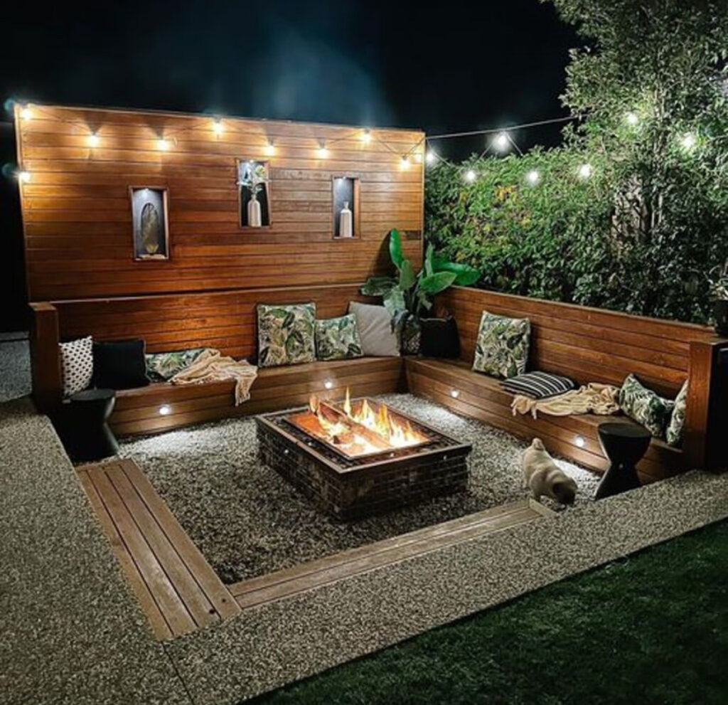 Sunken seating areas bring depth and intimacy to outdoor spaces. Pair a rectangular fire pit with built-in benches for a clean, modern look that feels both private and open. It’s a cozy conversation zone that elevates your backyard instantly.