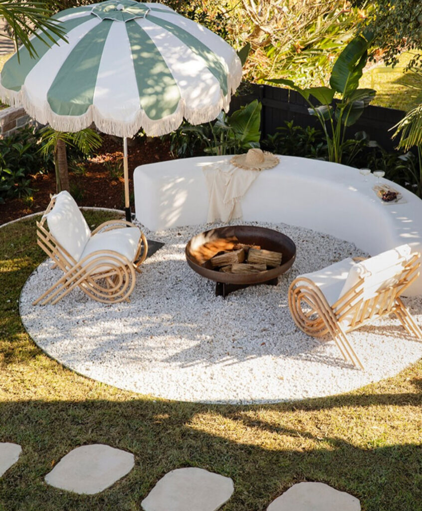 For a laid-back coastal vibe, combine a round fire pit with curved seating and a retro-inspired umbrella. This playful, beachy setup is perfect for sunny afternoons or cool evenings, making your outdoor lounge area feel like a vacation at home.