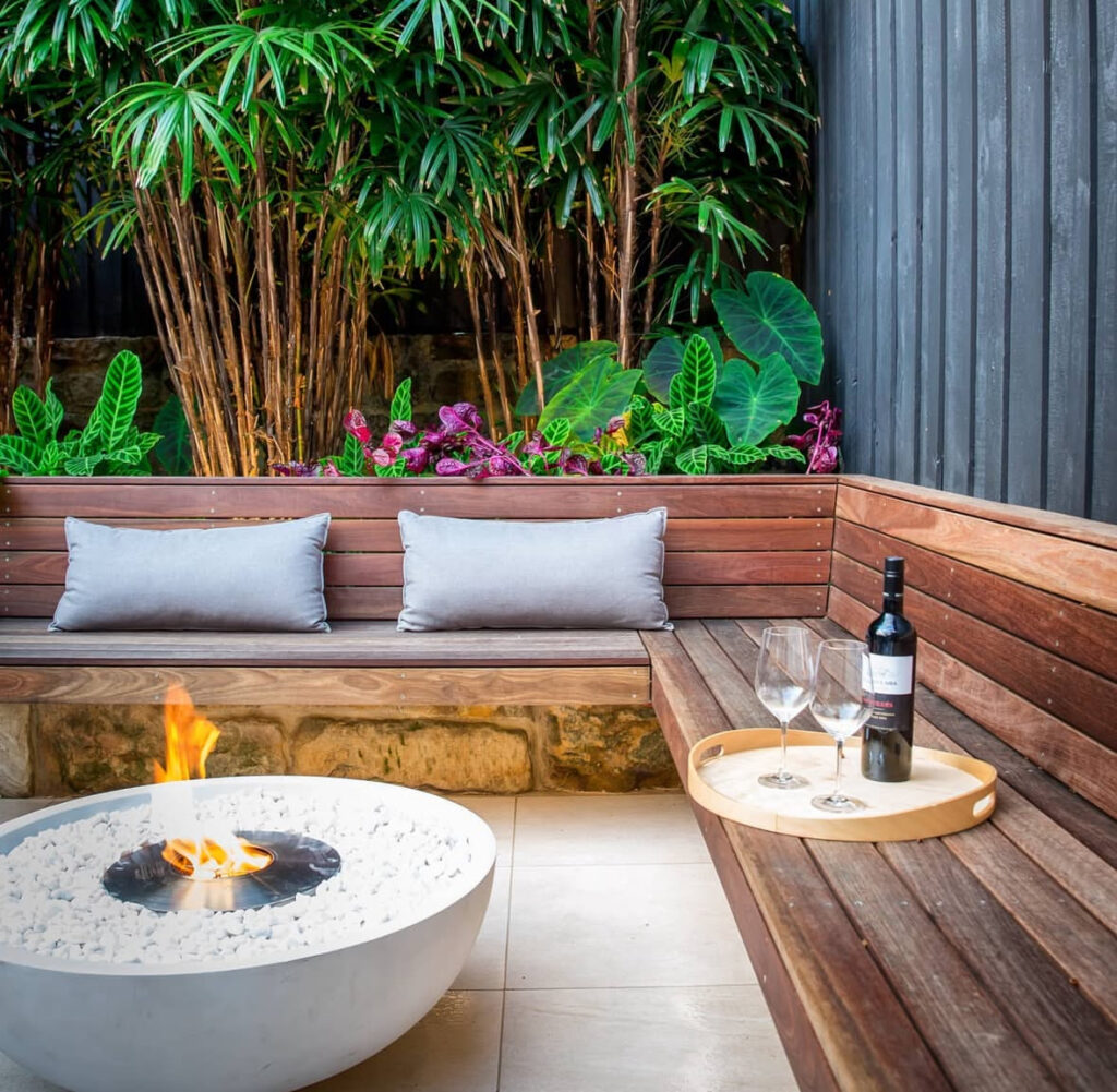Compact doesn’t mean compromising style. A small round fire pit surrounded by built-in benches makes even tight patios feel inviting. It’s an intimate, space-saving design that proves good things really do come in small packages.