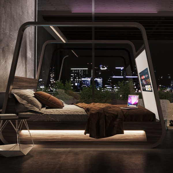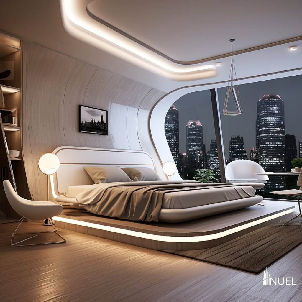 This bedroom merges futuristic design with cozy, human-centered elements. Ideal for slow evenings, reading, or simply enjoying city lights, it’s a space that feels indulgent yet grounded.