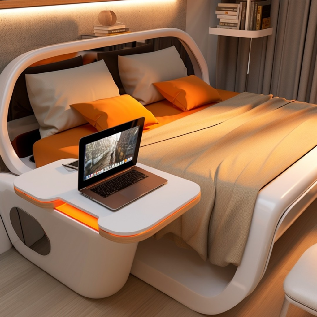 Function meets style in this highly integrated bedroom. Built-in shelving, lighting, and tech features surround the bed, creating a self-contained retreat. Smooth curves and warm orange accents break up the neutral tones, making the space inviting and practical.