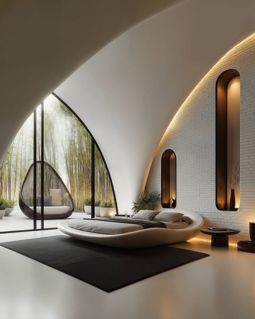 Towering glass panels and softly rounded architectural details bring nature into this futuristic sanctuary. A low, organic bed appears to float above a charcoal rug, while views of a bamboo grove enhance the serene, spa-like atmosphere.