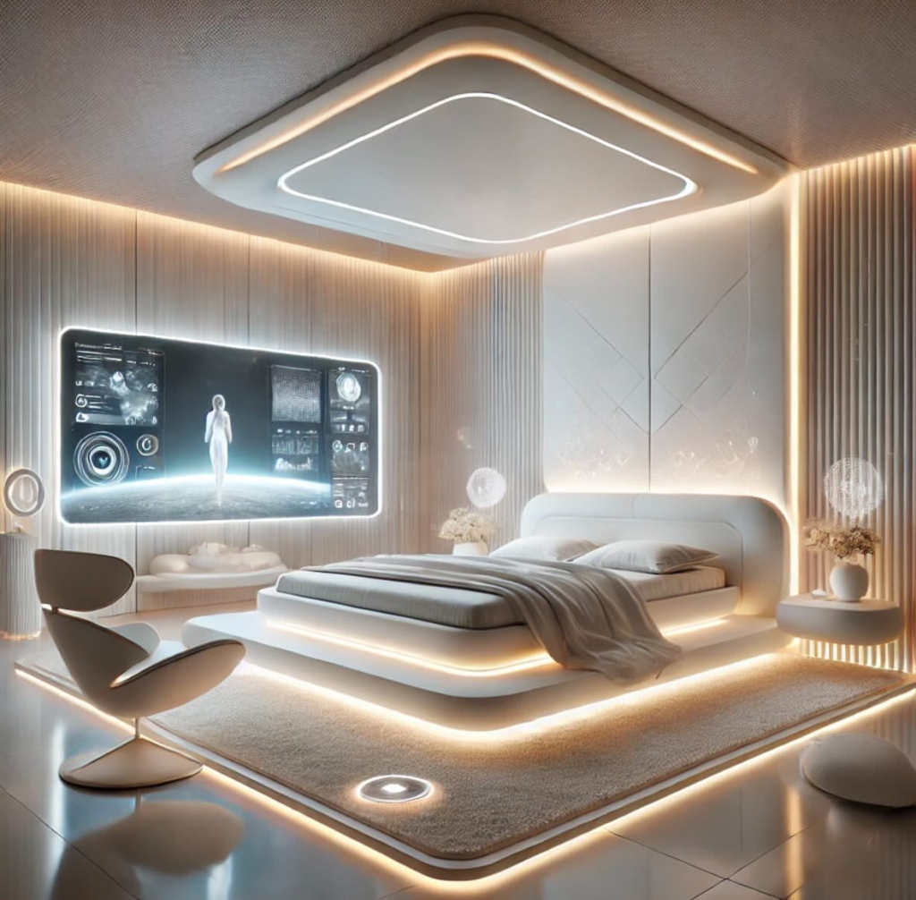 Smart technology can be integrated seamlessly, from automated lighting and climate control to built-in speakers and wireless charging stations. Accessories like holographic accents, abstract wall art, and modular furniture pieces enhance the forward-thinking vibe.
