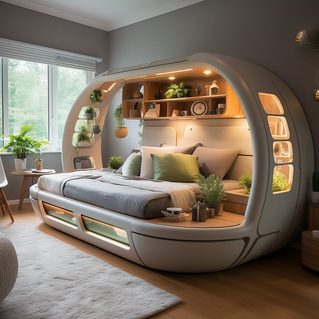 Plants, wood, and soft lighting transform this high-tech bedroom into a serene, eco-inspired sanctuary. The capsule-like bed integrates shelves, lighting, and greenery, creating a miniature habitat that feels both futuristic and grounded.