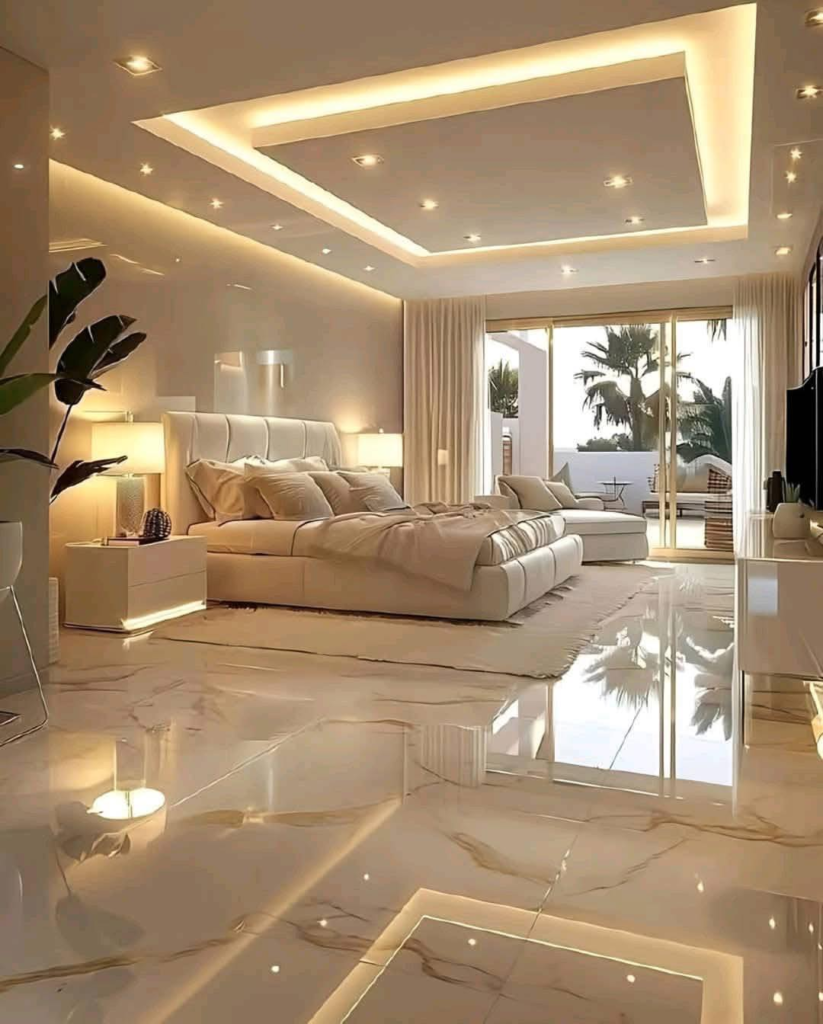 Futuristic luxury meets resort-like elegance in this polished suite. Marble flooring, an oversized platform bed, and tiered ceiling lights create an opulent atmosphere reminiscent of a high-end penthouse.