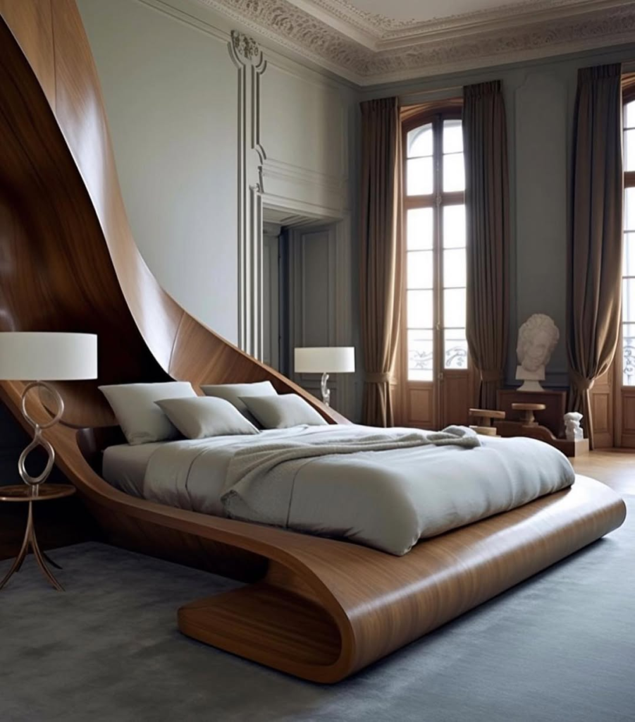 The dramatic curves of this wooden bed command attention, seamlessly merging architectural sophistication with futuristic form. The sweeping design flows into the wall, creating a wave-like visual that elevates the entire bedroom.