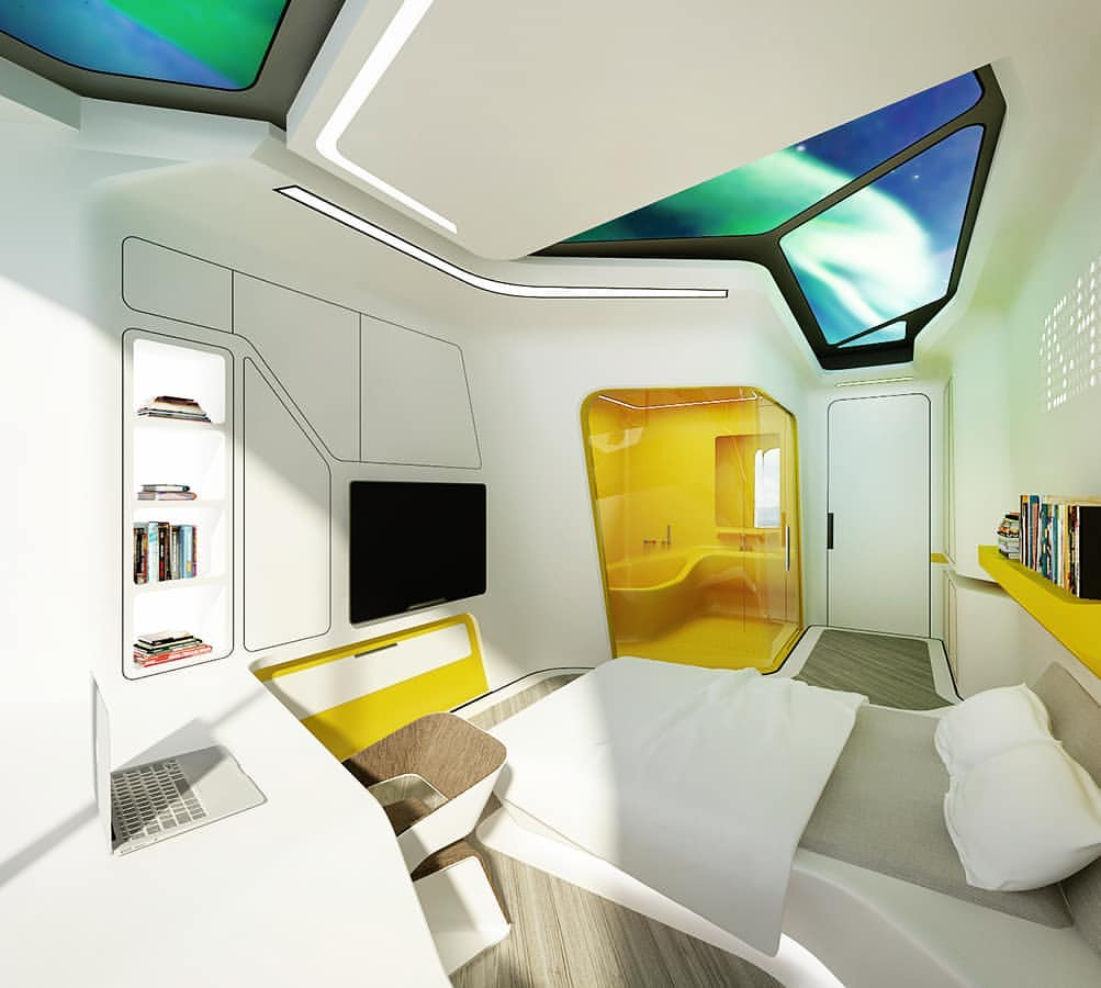 Crisp white surfaces and integrated storage make this bedroom feel futuristic yet functional. Pops of yellow add optimism, while the skylight-inspired ceiling draws the eye upward, expanding the perceived space.