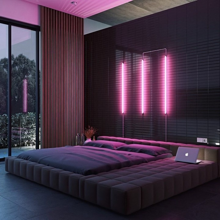 Dark textures, vertical neon lights, and minimalist furnishings create a sleek, cinematic atmosphere. The bedroom feels inspired by cyberpunk aesthetics while remaining functional and cozy.