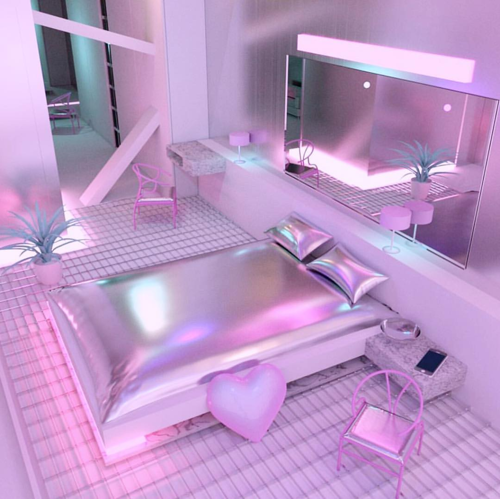 Iridescent bedding, pastel lighting, and glossy surfaces create a playful, dreamlike bedroom. The design feels futuristic through softness rather than harsh angles.
