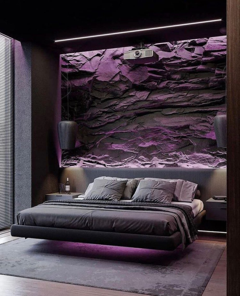 This design emphasizes that texture and lighting can define modern bedrooms as much as furniture, creating a space that feels alive and engaging.