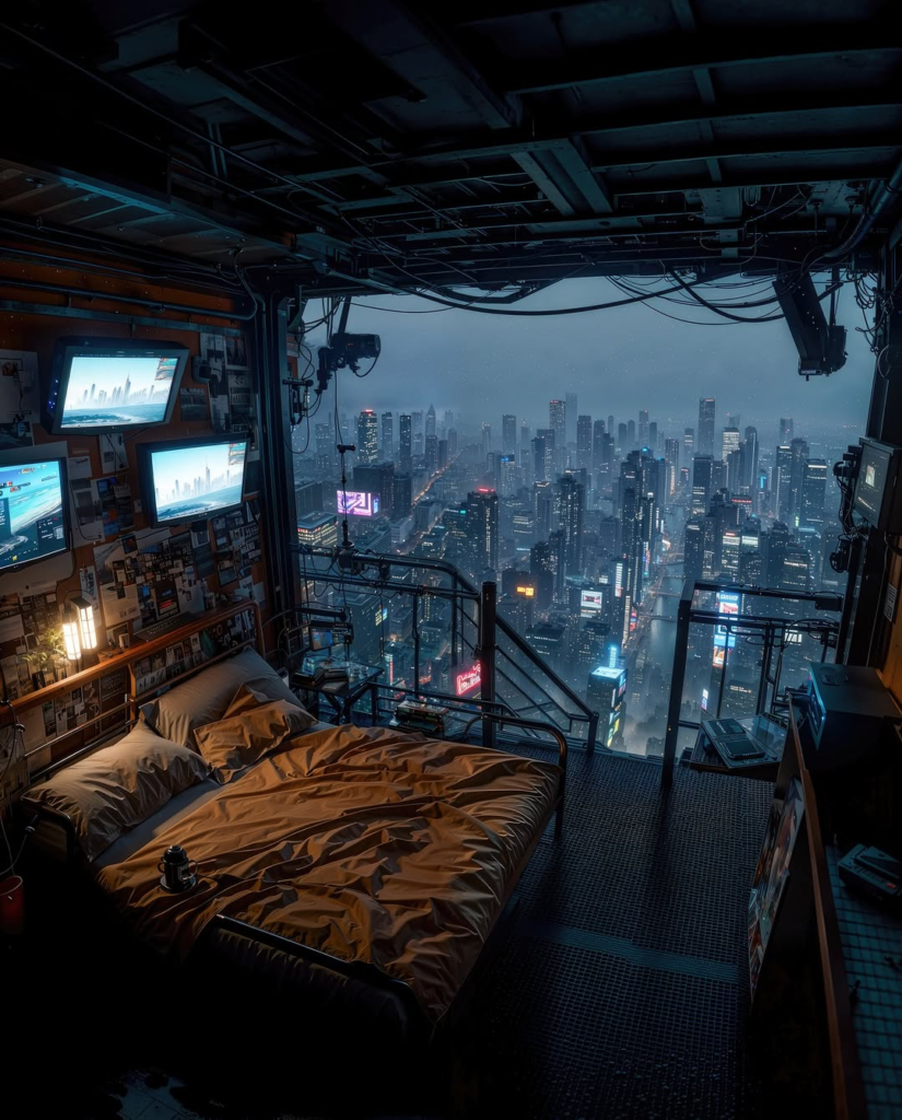 Exposed structural elements, layered technology, and panoramic views create a cinematic urban retreat. The room feels like a story in itself, combining city energy with futuristic design.