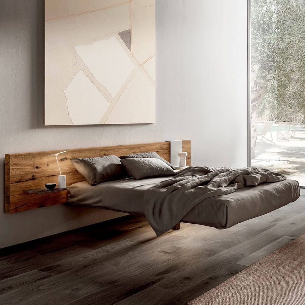 Floating beds, clean lines, and neutral palettes create a bedroom with a sense of weightlessness. Natural wood tones and minimalist décor encourage relaxation and focus.