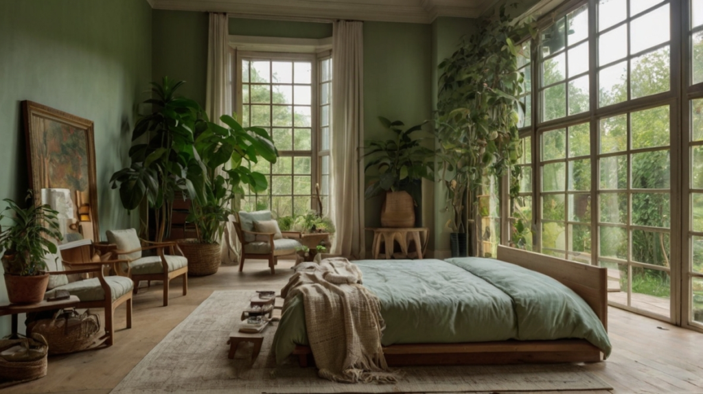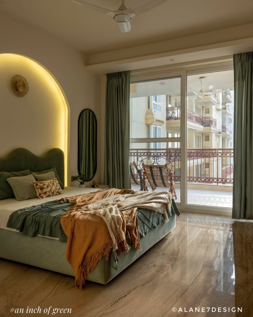 Natural light enhances the serene atmosphere, creating a room that encourages slow mornings and early nights. This design transforms green from a color into a feeling—calm, restorative, and harmonious.