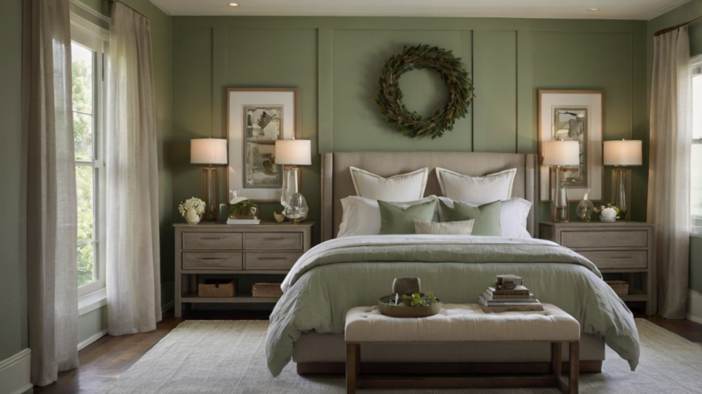 This bedroom masters the art of understated elegance with a palette of sage green and neutral tones. The muted green accent wall sets a calm backdrop for white and taupe layers, creating a soothing visual rhythm. Symmetrically placed bedside tables and wall sconces provide structure, while a feather wreath introduces subtle texture.