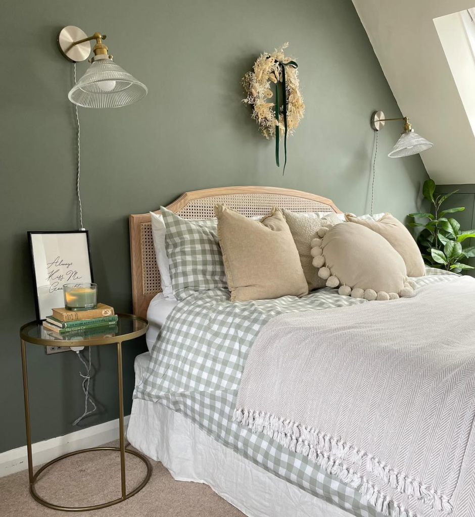 This bedroom channels cozy nostalgia with a combination of subtle cottagecore accents and refined styling. Sage gingham bedding introduces delicate patterning, while soft neutrals and a rattan headboard add warmth and texture.