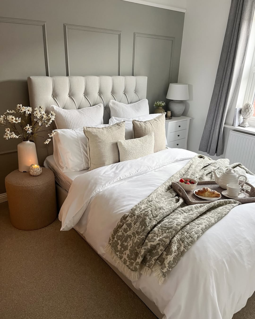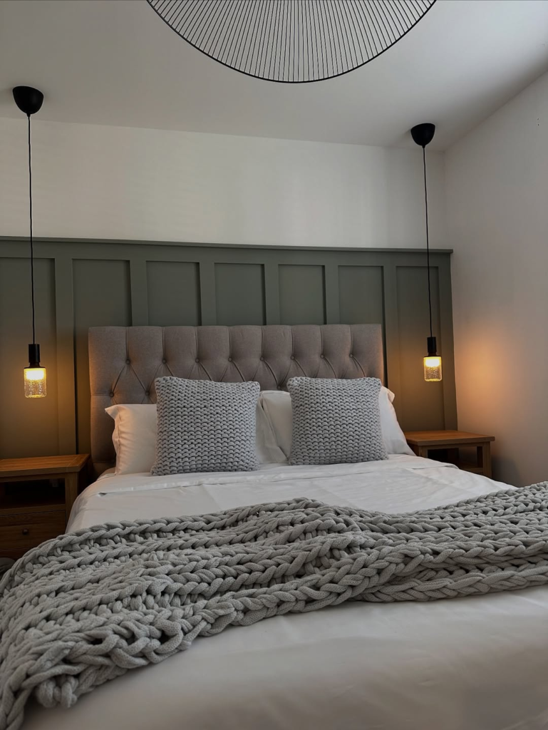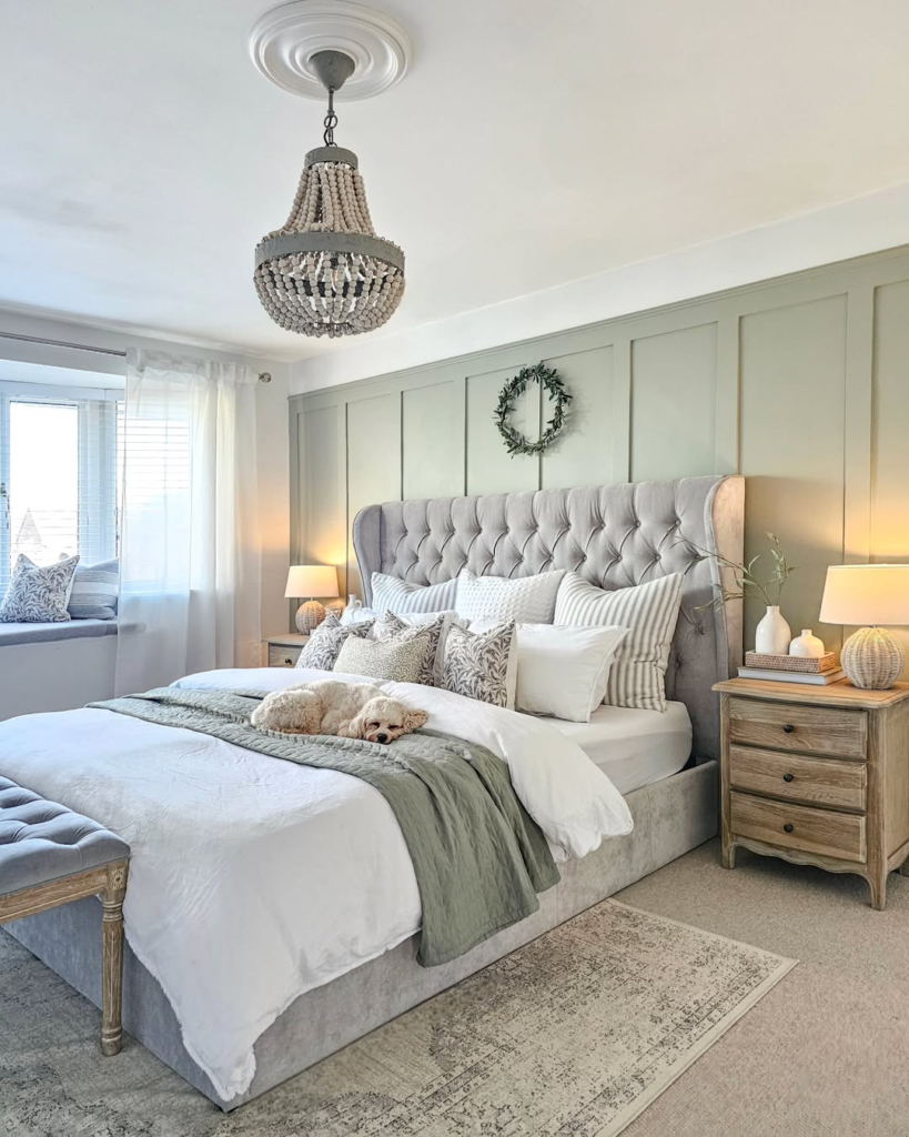 Soft sage paneling gives this bedroom a peaceful, spa-like ambiance. Textured bedding and a tufted headboard add subtle depth, ensuring the space feels layered without overwhelming the senses.