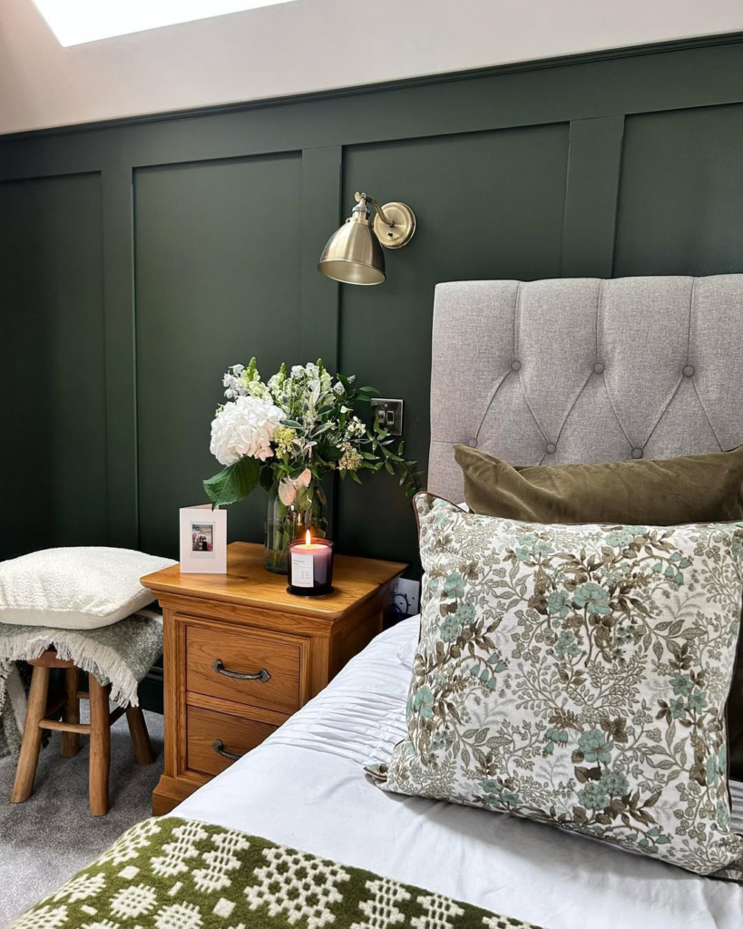 Dark green paneling paired with soft florals and a tufted gray headboard creates a bedroom that feels both charming and approachable. Layering adds depth without clutter, inviting you to enjoy a book, fresh blooms, or the glow of candlelight.