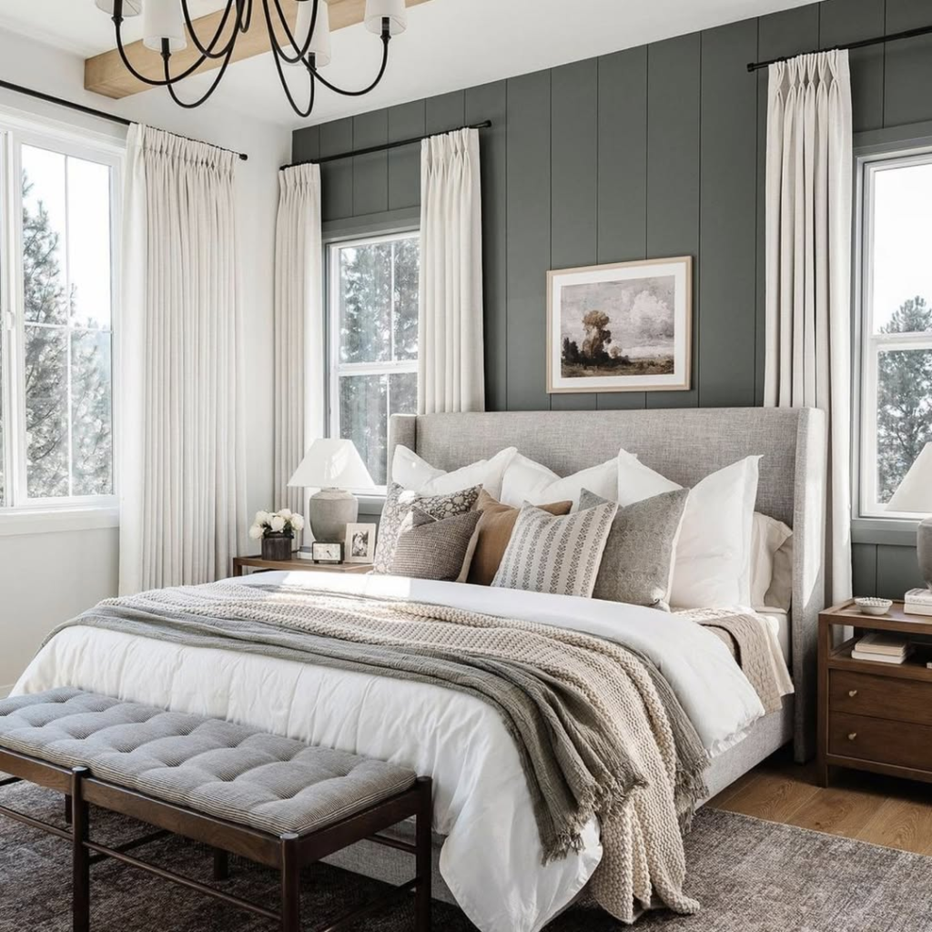 Neutral linens and plush bedding meet a striking charcoal-green wall to create a bedroom that balances refinement with comfort. Oversized artwork, structured drapes, and wood accents provide grounding elegance, making the space feel both stylish and approachable.