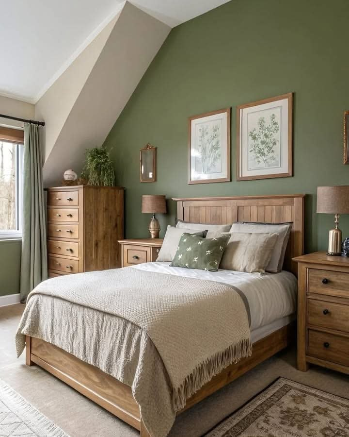 Muted olive walls provide subtle depth, while creamy whites and sand-toned textiles keep the room feeling light and airy. This bedroom demonstrates that green can be calming without being overwhelming.