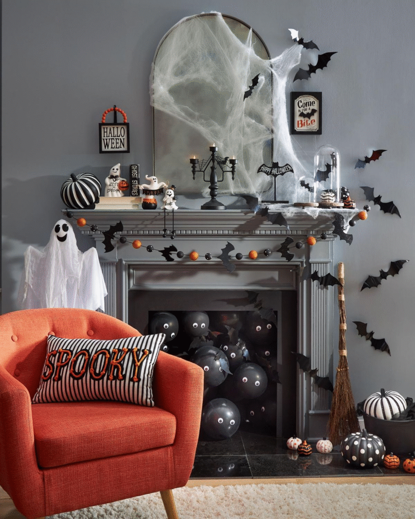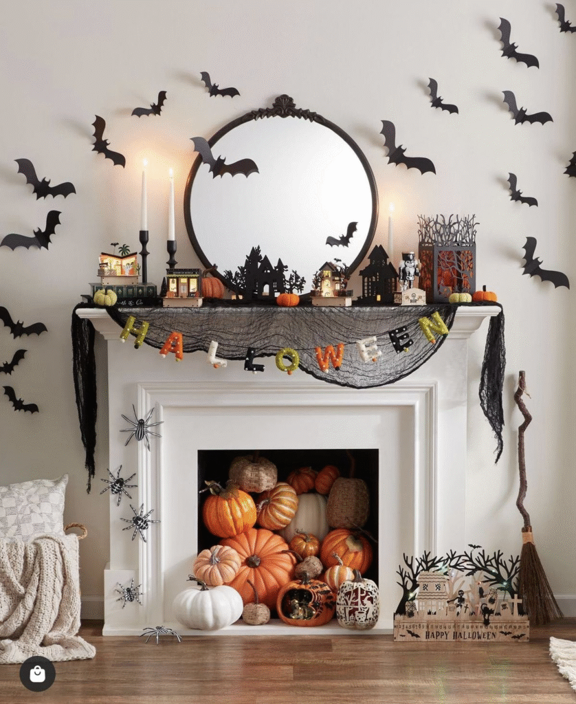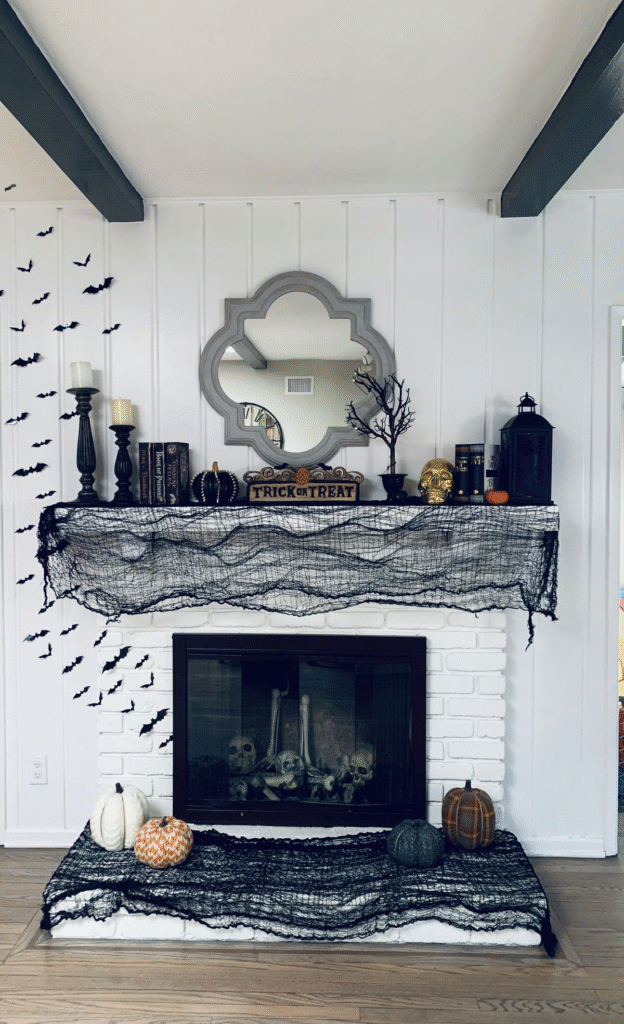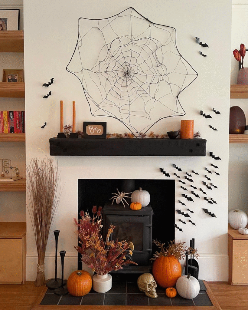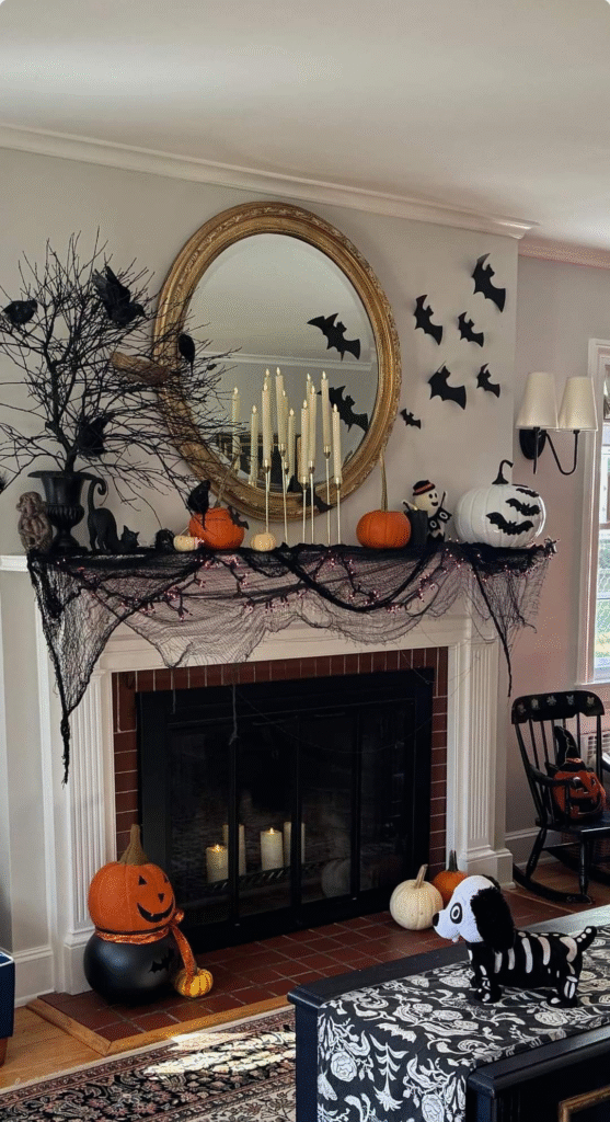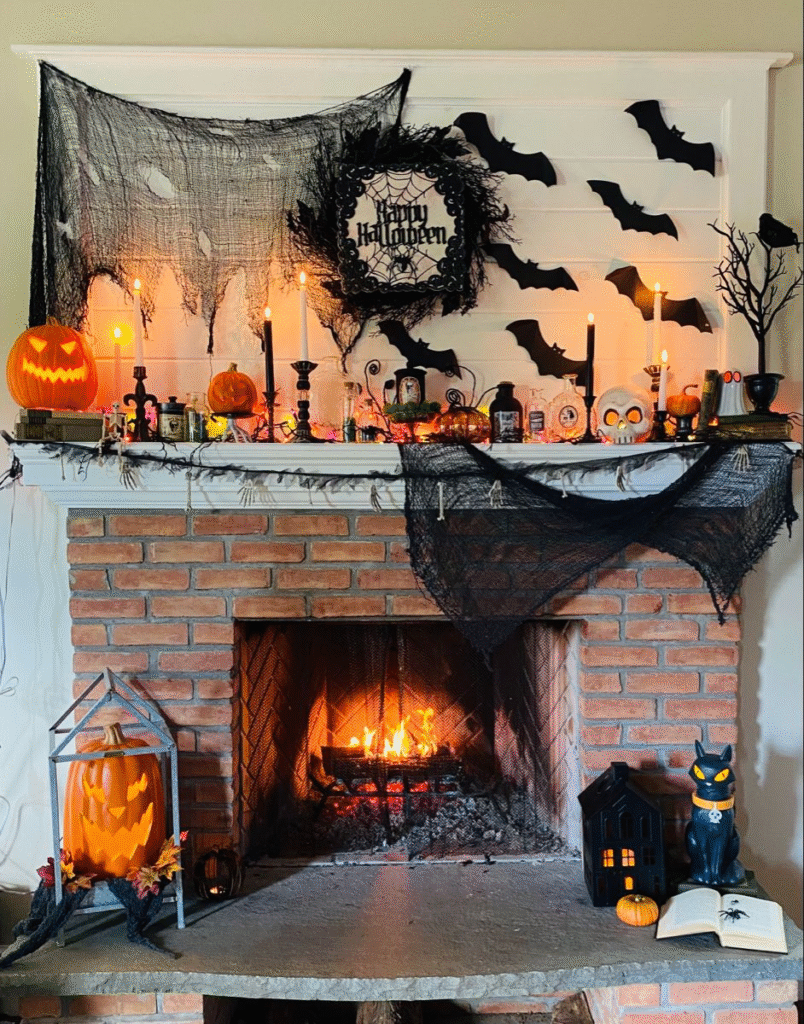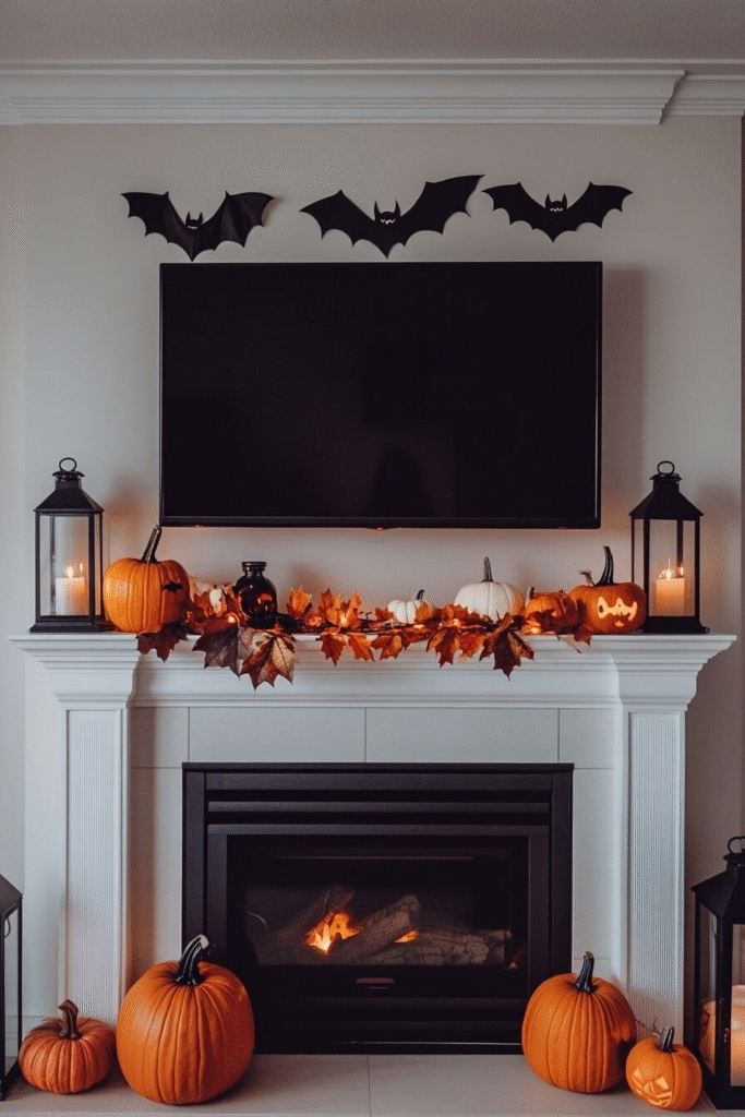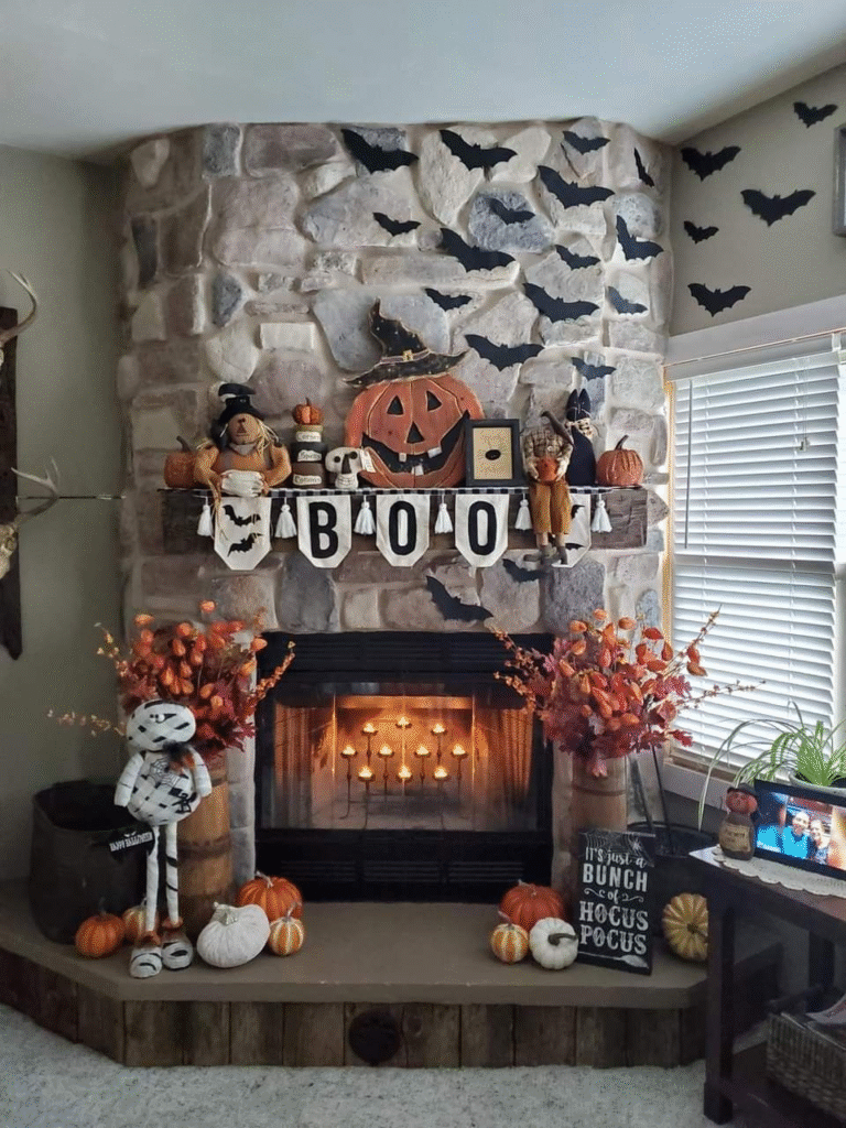 If you’re thinking about ways to highlight your fireplace this Halloween, bats are the perfect place to start. Adding bat cutouts or decals above the mantel instantly creates a festive yet stylish look. It’s a simple touch that brings energy to the room and makes your fireplace stand out.