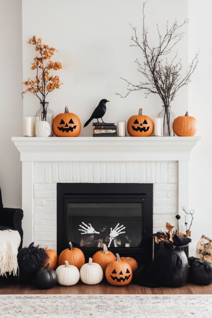 A subtle Halloween fireplace theme is perfect for those who prefer understated style. Gentle accents like small pumpkins, soft lighting, or delicate garlands create a seasonal look without being overwhelming. It’s cozy, inviting, and still true to the Halloween spirit.