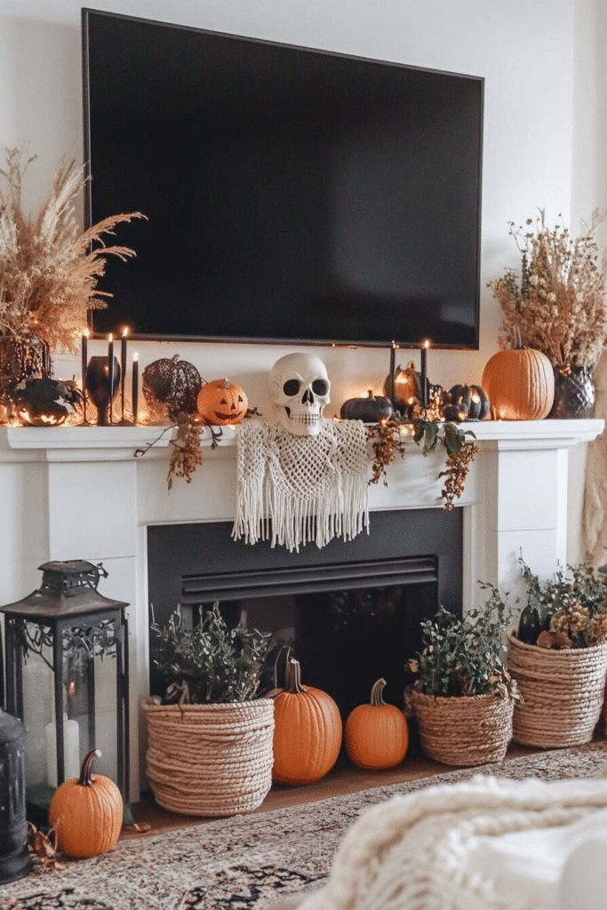 A skull-themed fireplace is ideal for adding a bold, dramatic flair. Whether through skull garlands, figurines, or art pieces, this design instantly grabs attention. It’s an eye-catching and unique way to decorate your fireplace for Halloween.