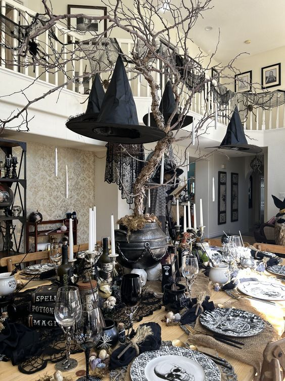 Witch-inspired décor is a Halloween classic. Layer deep purples, blacks, and silvers with cauldrons, potion bottles, or candelabras to bring a magical vibe to your table. This look can be as subtle or as bold as you want, but it always delivers that unmistakable Halloween energy.