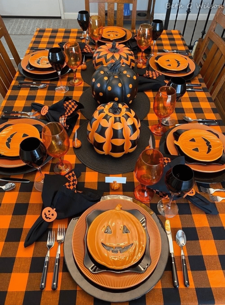 For a lighthearted take, design a fun Halloween table full of bold patterns, whimsical centerpieces, and pops of color. Think of playful details like themed napkins, quirky glassware, or mini pumpkins. This setup works well if you want your celebration to feel joyful rather than spooky.