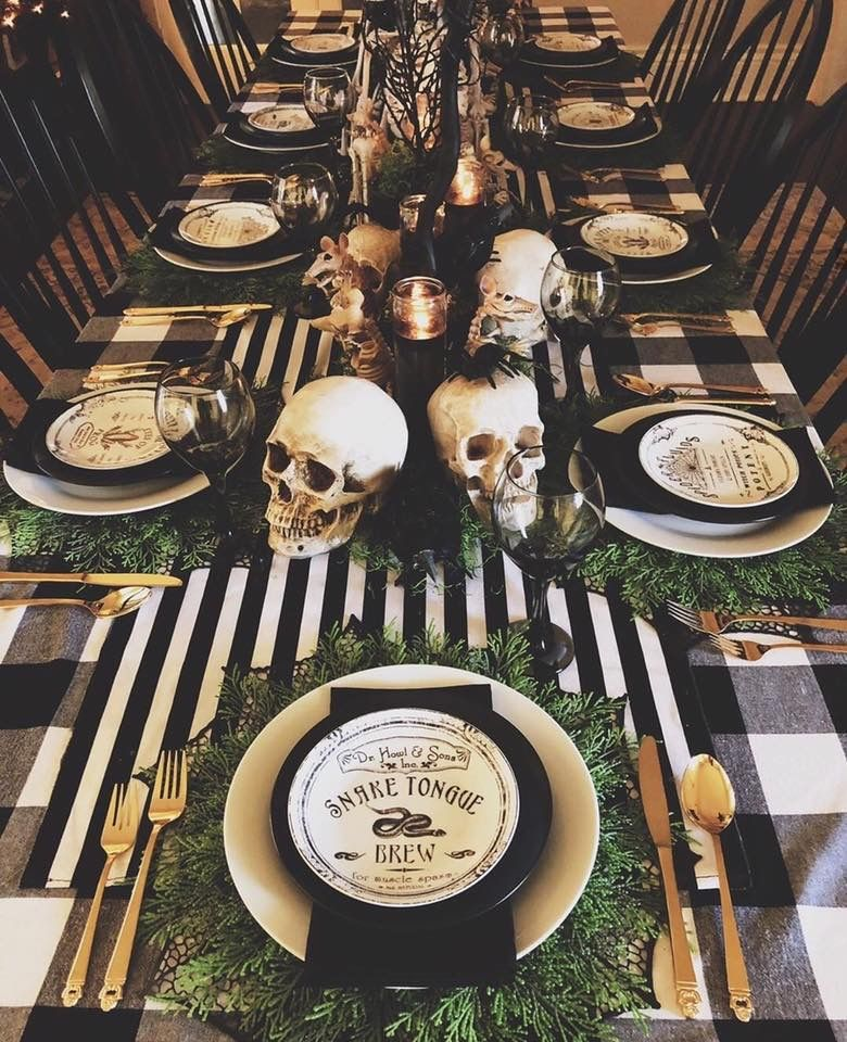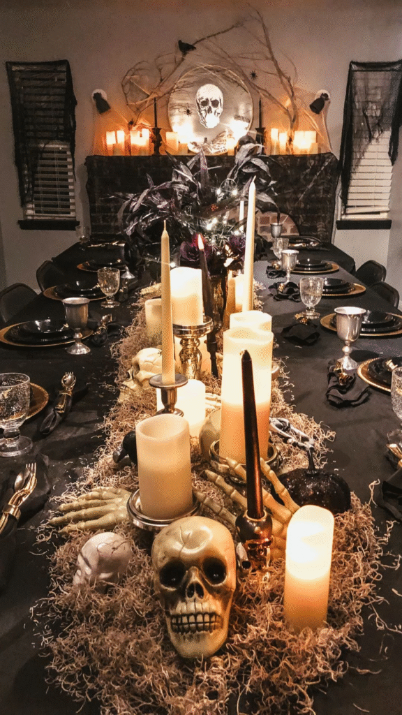 Skulls add a striking focal point to a Halloween tablescape. Pair them with candles, moss, or metallic details for an edgy yet stylish effect. Whether you go minimalist with one statement piece or dramatic with multiple skull accents, this idea instantly creates a spooky centerpiece.