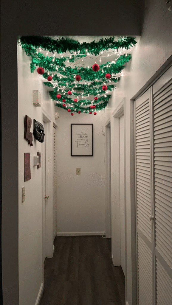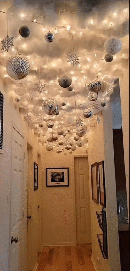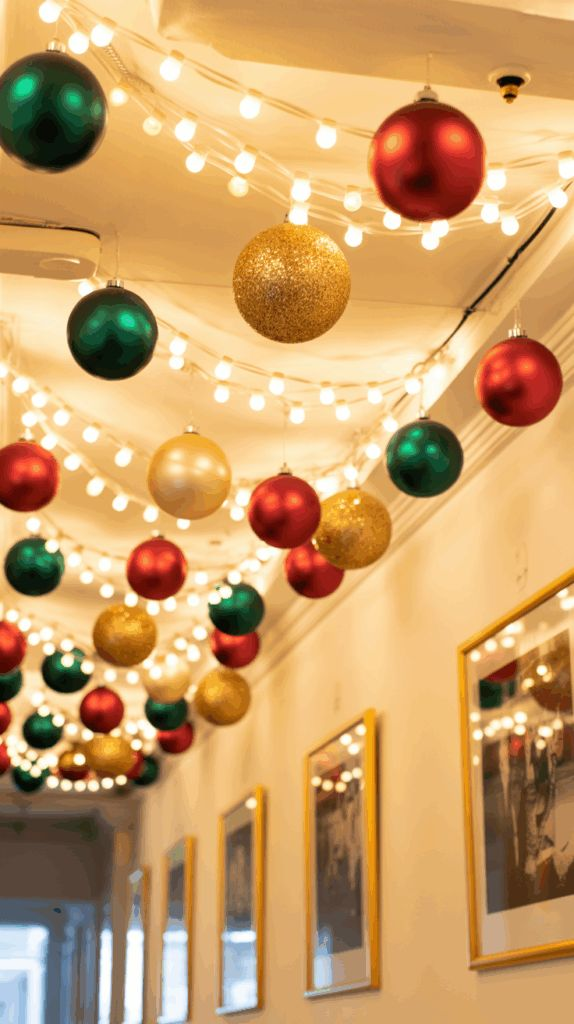 Using vertical space is a smart way to transform a hallway, and hanging decorations make that possible. Whether it’s lightweight ornaments, small wreaths, or festive ribbons, suspended décor adds movement and interest without overwhelming the area. It’s an excellent option for anyone wanting to think outside the box.