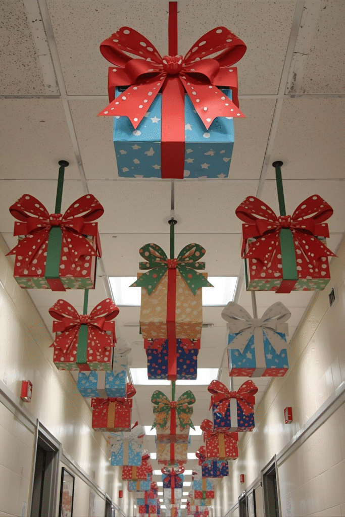 Hanging presents are a unique twist on traditional hallway décor. By placing gift boxes or present-shaped ornaments along the wall or from hooks, you create a standout feature that feels both festive and artistic. It’s ideal for anyone wanting a memorable and creative holiday display.