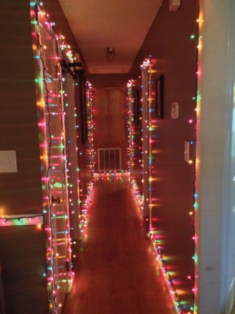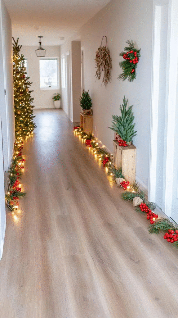 Lighting plays a big role in holiday ambiance, and glowing decorations can completely transform your hallway at night. Soft lights, illuminated garlands, or subtle LED accents add warmth and charm. This style brings a cozy glow that makes your home feel magical after sunset.