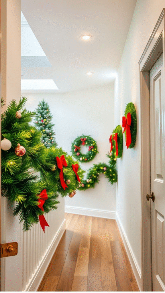 A lovely hallway arrangement relies on charming accents and gentle color pairings. This approach creates a welcoming atmosphere that feels warm and thoughtful. Its soft visuals make it a delightful addition to any home during the holidays.
