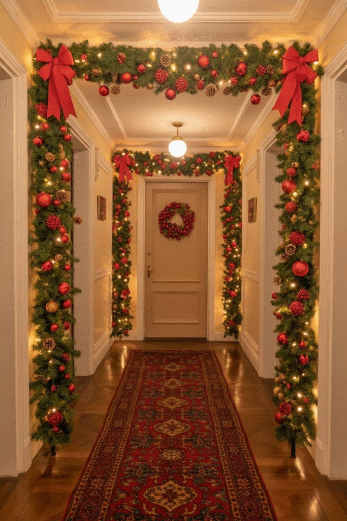 Traditional holiday decorations bring back familiar warmth and timeless appeal. Think classic reds, greens, and nostalgic ornaments. This reliable style adds comfort and seasonal joy, making your hallway feel inviting and festive.