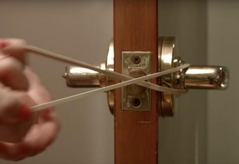 If a door keeps swinging shut or accidentally locking, a rubber band can keep it open. Loop the band around one doorknob, twist it into an X over the latch, and stretch it around the other knob. The band holds the latch back, preventing the door from clicking shut. It’s especially handy when carrying groceries, moving furniture, or letting pets wander freely.