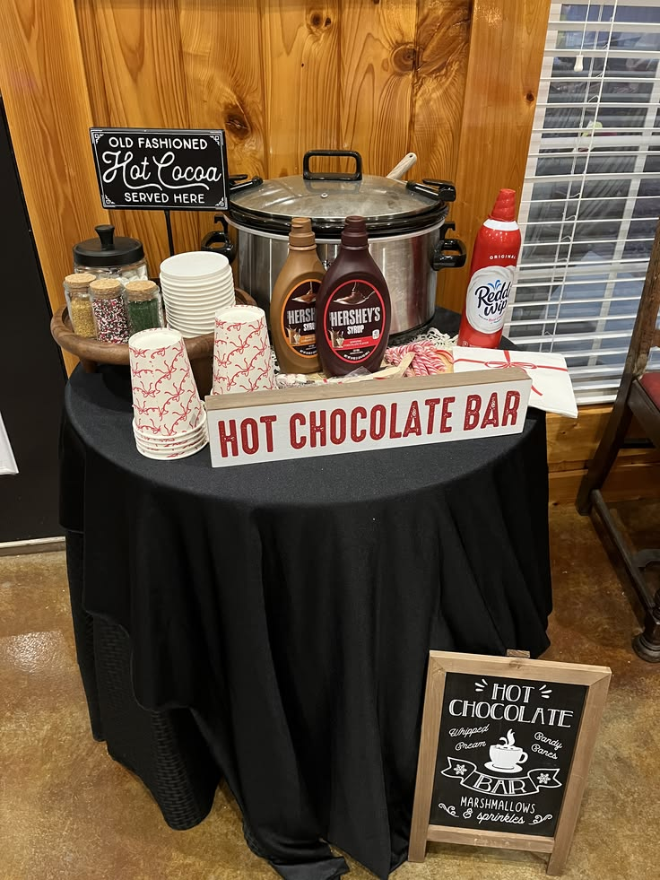 Sometimes simplicity is the most effective approach. A straightforward cocoa bar prioritizes ease of use and clean organization. Place the hot cocoa dispenser at one end, followed by neatly arranged mugs and toppings in a logical flow.